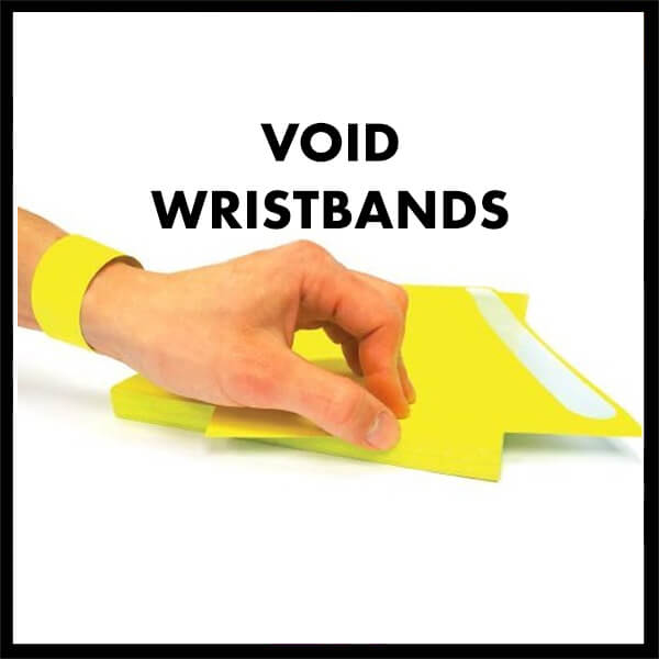 Essential Wristbands are supplied on an SRA3 or A4 sheet in 120 Micron Polyester ready to be fully personalised on demand then peeled off and placed around the wrist. The word VOID appears when these are removed or tampered with.